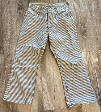 One of the most interesting expansions of hickory stripe came with children’s workwear. Brands like OshKosh B’Gosh recognized that many children, especially those growing up on farms and in rural communities, needed sturdy clothes for outdoor play and chores. The company introduced miniature versions of classic work overalls in hickory stripe, often designed to match their parents’ workwear. These garments became a staple of American childhood in the mid-20th century, combining durability with a touch of nostalgia.
