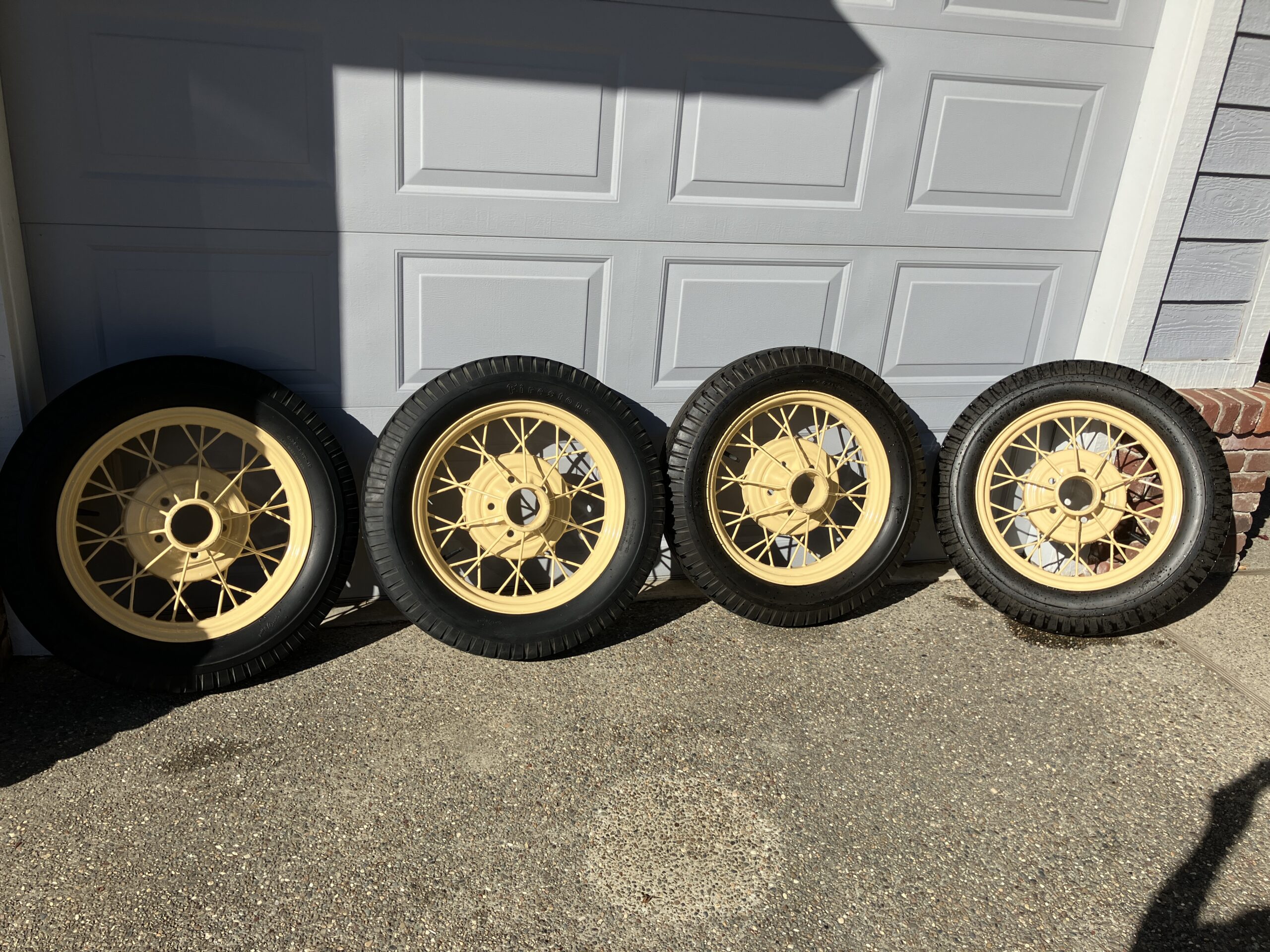 Set of four 19 inch rims and wheels. Two tires with lots of tread, Two running out. Tacoma Cream Powder Coat in great shape.